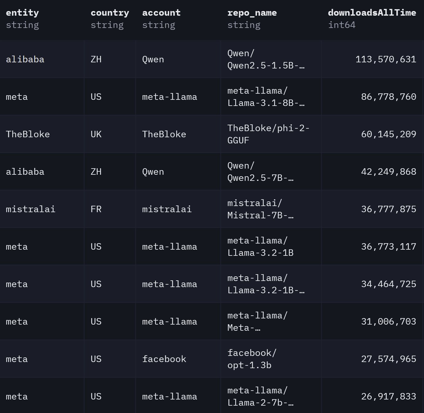 The data shown in this article was collected on October 1, 2025. After identifying the 50 open-source entities with the most downloads, we collected all the models associated with them.