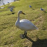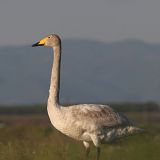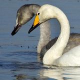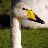 Whooper Swan (Cygnus cygnus): It is also a huge bird, similar to Mute Swan. It has white plumage, but many birds during spring and summer have stained brown head and neck. It has a long neck and its upper part generally held straight when swimming. Best told from the Mute and Tundra Swans by long, wedge-shaped bill, mainly yellow with black tip, yellow forming pointed wedge, reaching in front of nostril. Juveniles are grey, less brown and slightly paler than juvenile Mute Swans, very similar to Tundra Swans. Often slightly paler.