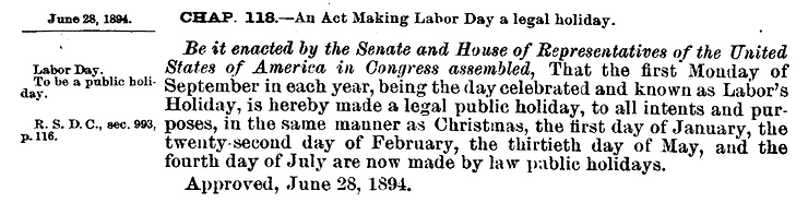 On June 28, 1894, the 53rd Congress passed an act making the first Monday in September of each year a legal holiday. Here’s how Rep. Lawrence McGann (D-IL), who sat on the Committee on Labor, argued for the holiday: