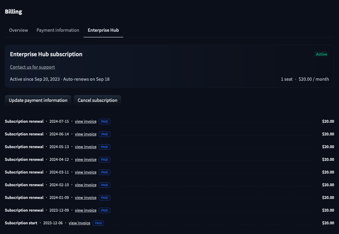 Compute services usage is billed separately from PRO and Enterprise Hub subscriptions (and potential private storage). Invoices for compute services are edited at the beginning of each month.