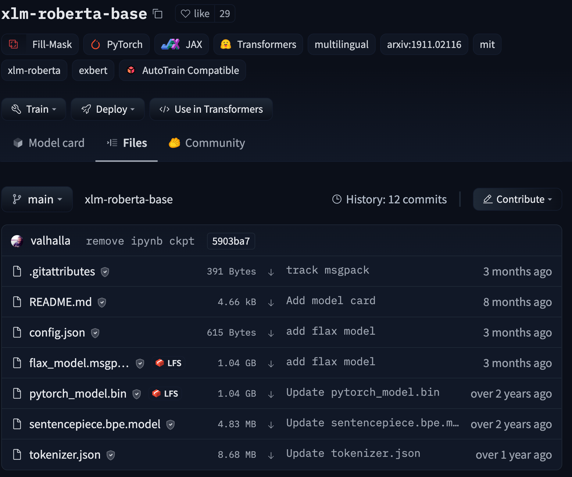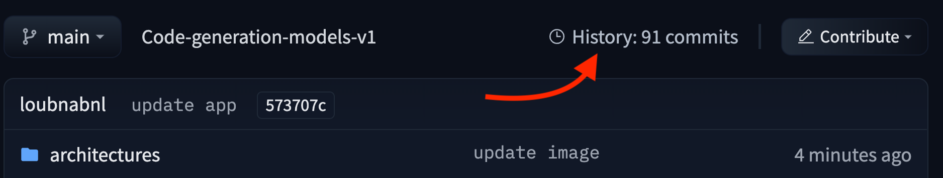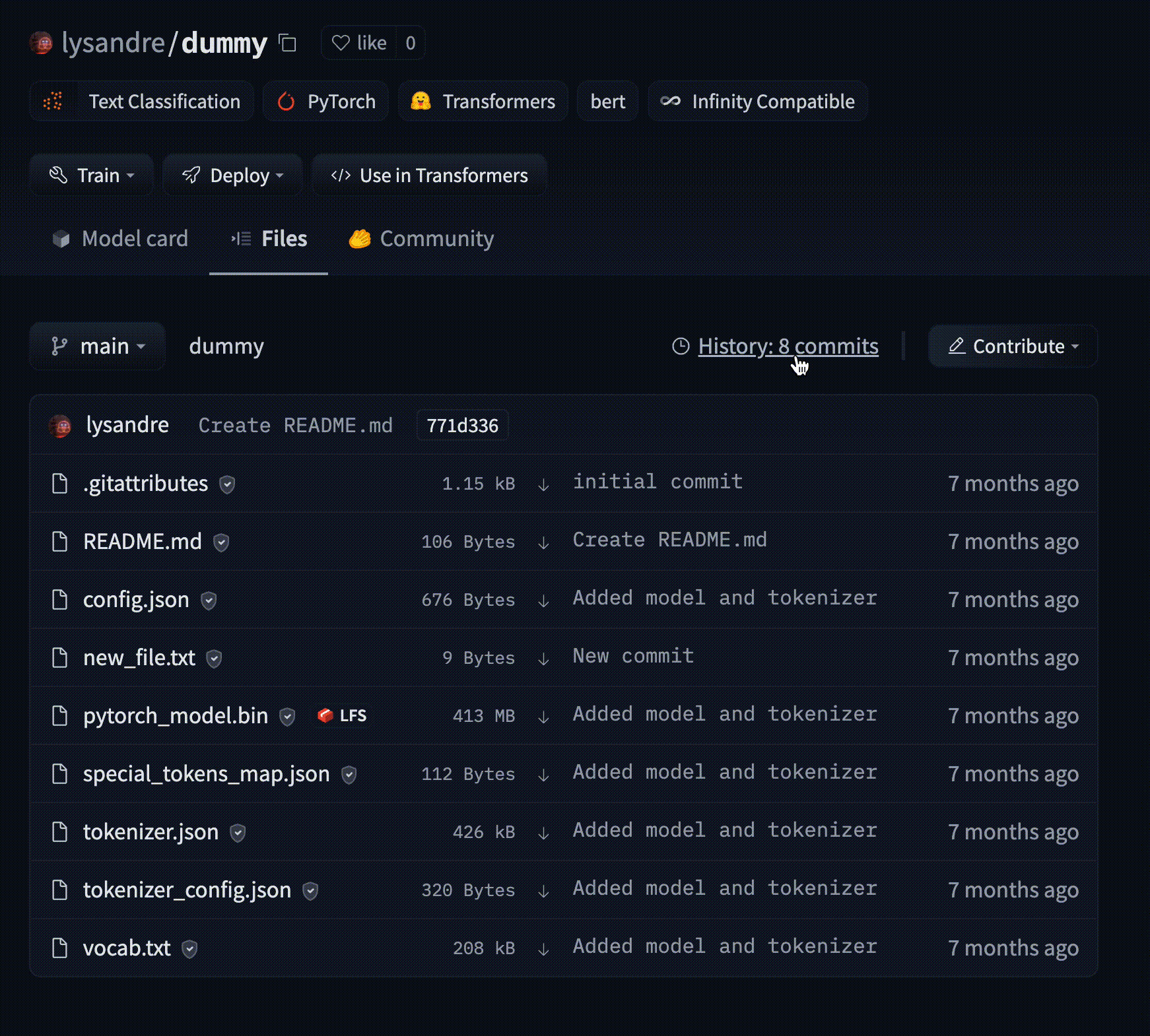 Every time you go through the add-commit-push cycle, the repo will keep track of every change you’ve made to your files. The UI allows you to explore the model files and commits and to see the difference (also known as diff) introduced by each commit. To see the history, you can click on the History: X commits link.