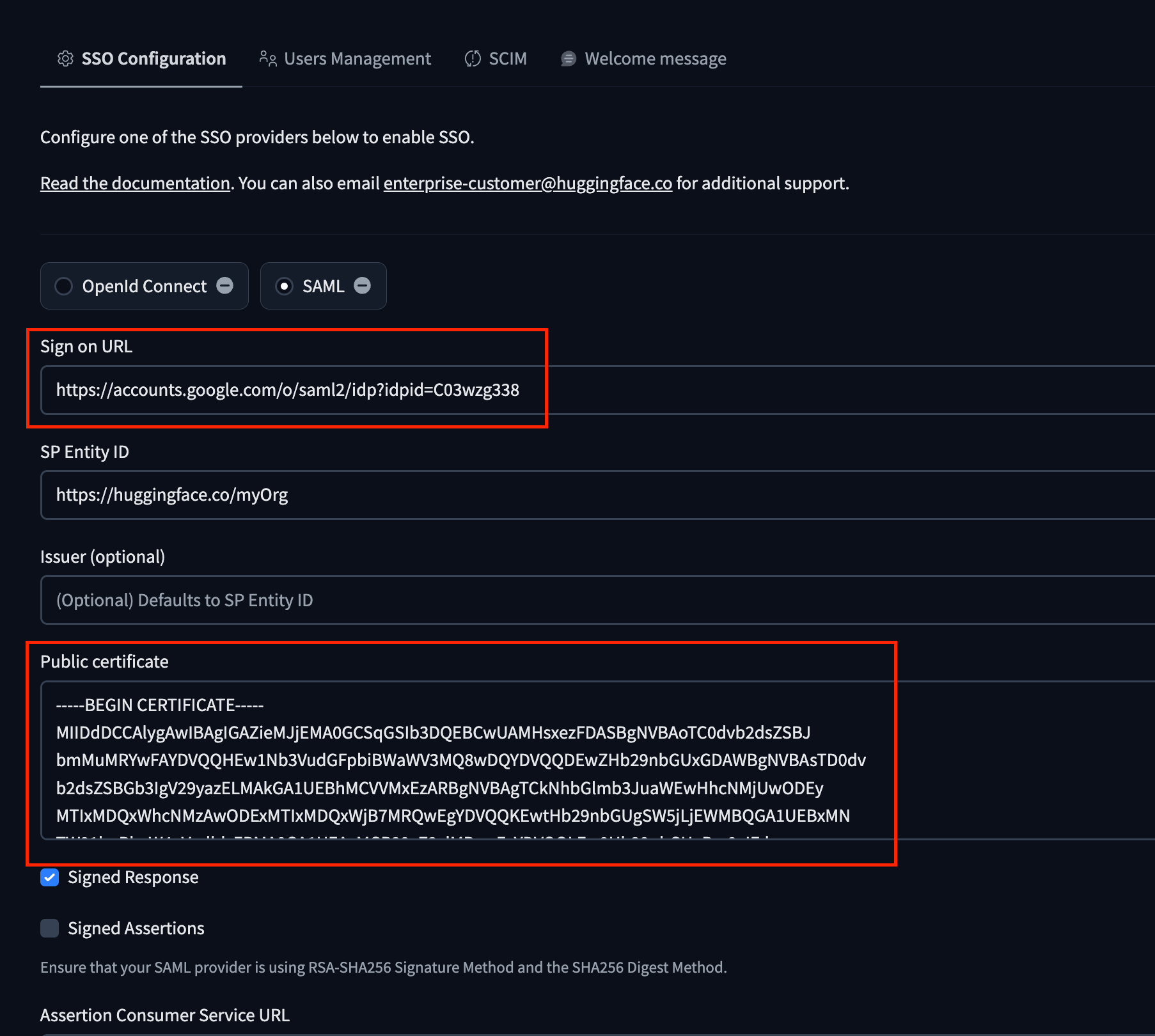 - Copy the Certificate from Google into the corresponding field on Hugging Face. The public certificate must have the following format: