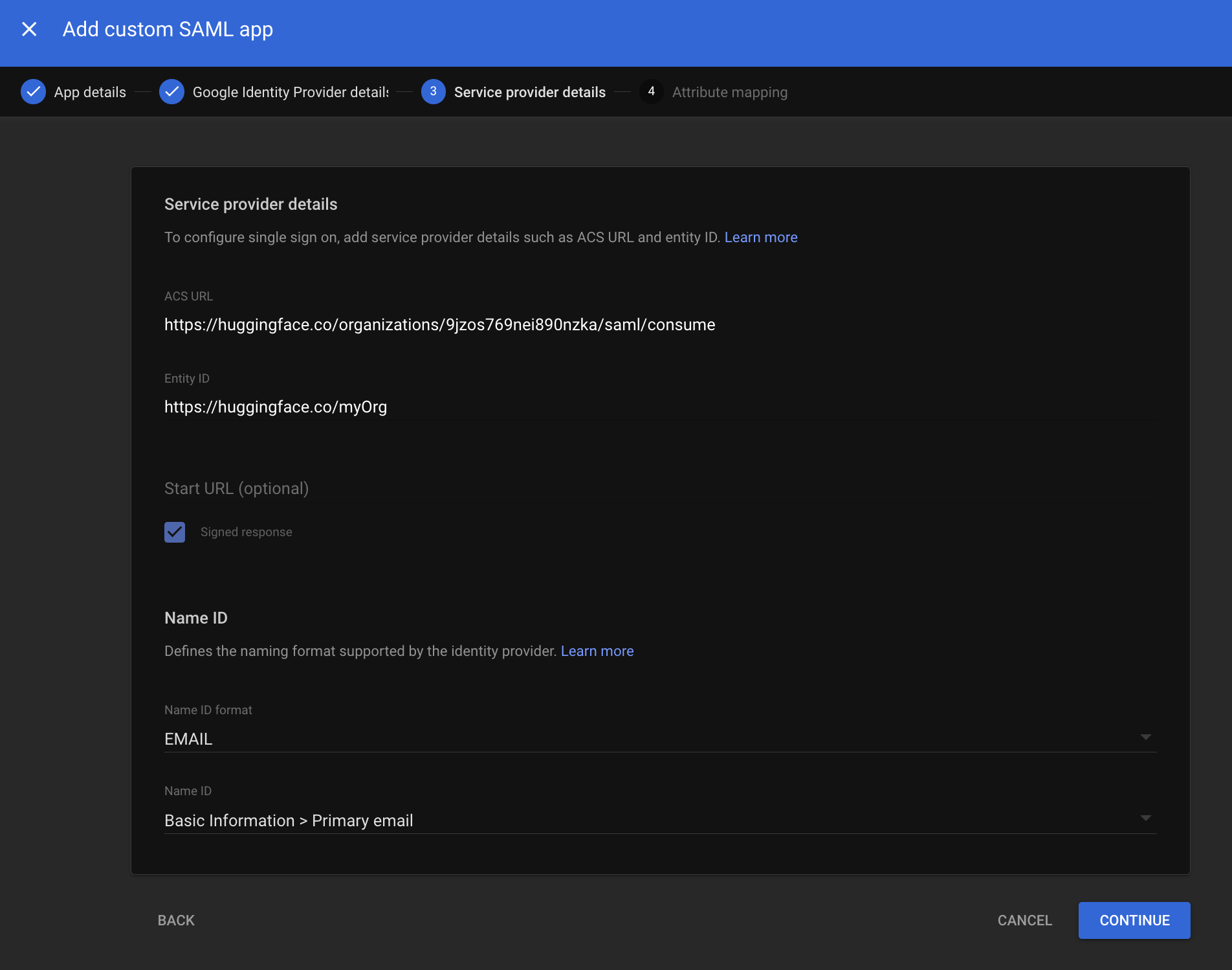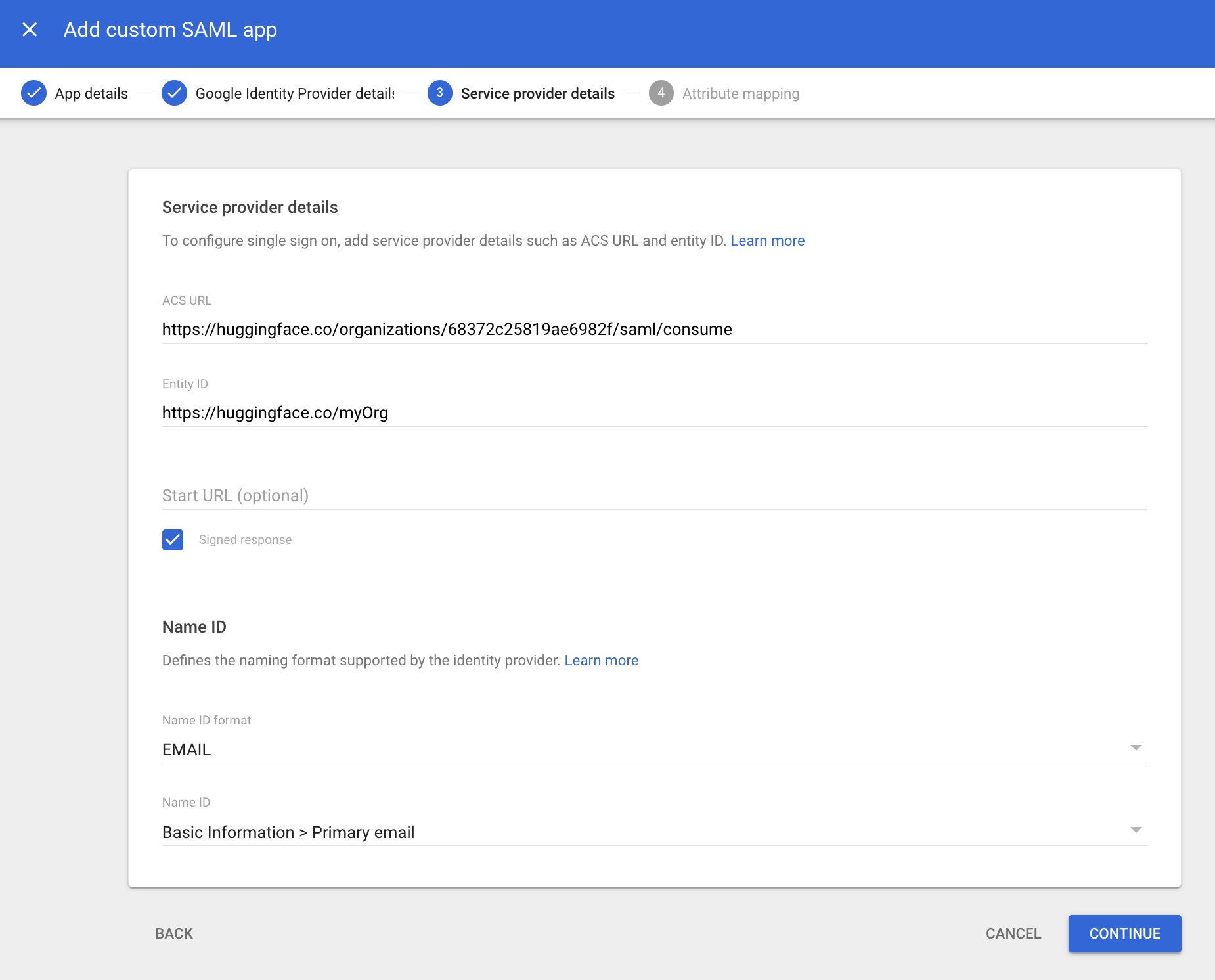 Step 3: Configure Google with Hugging Face’s SP Details