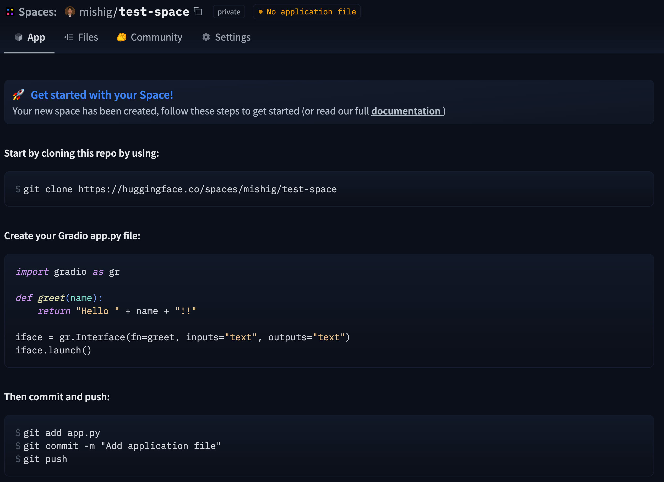 To make a new Space, visit the Spaces main page and click on Create new Space. Along with choosing a name for your Space, selecting an optional license, and setting your Space’s visibility, you’ll be prompted to choose the SDK for your Space. The Hub offers three SDK options: Gradio, Docker and static HTML. If you select “Gradio” as your SDK, you’ll be navigated to a new repo showing the following page: