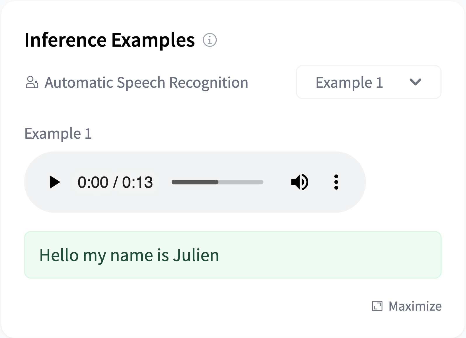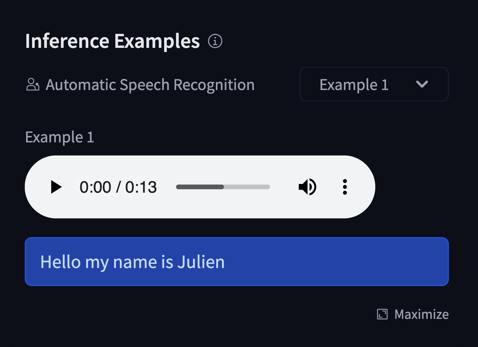 example_title: Speech sample 2Note that you can also include example files in your model repository and use them as:
