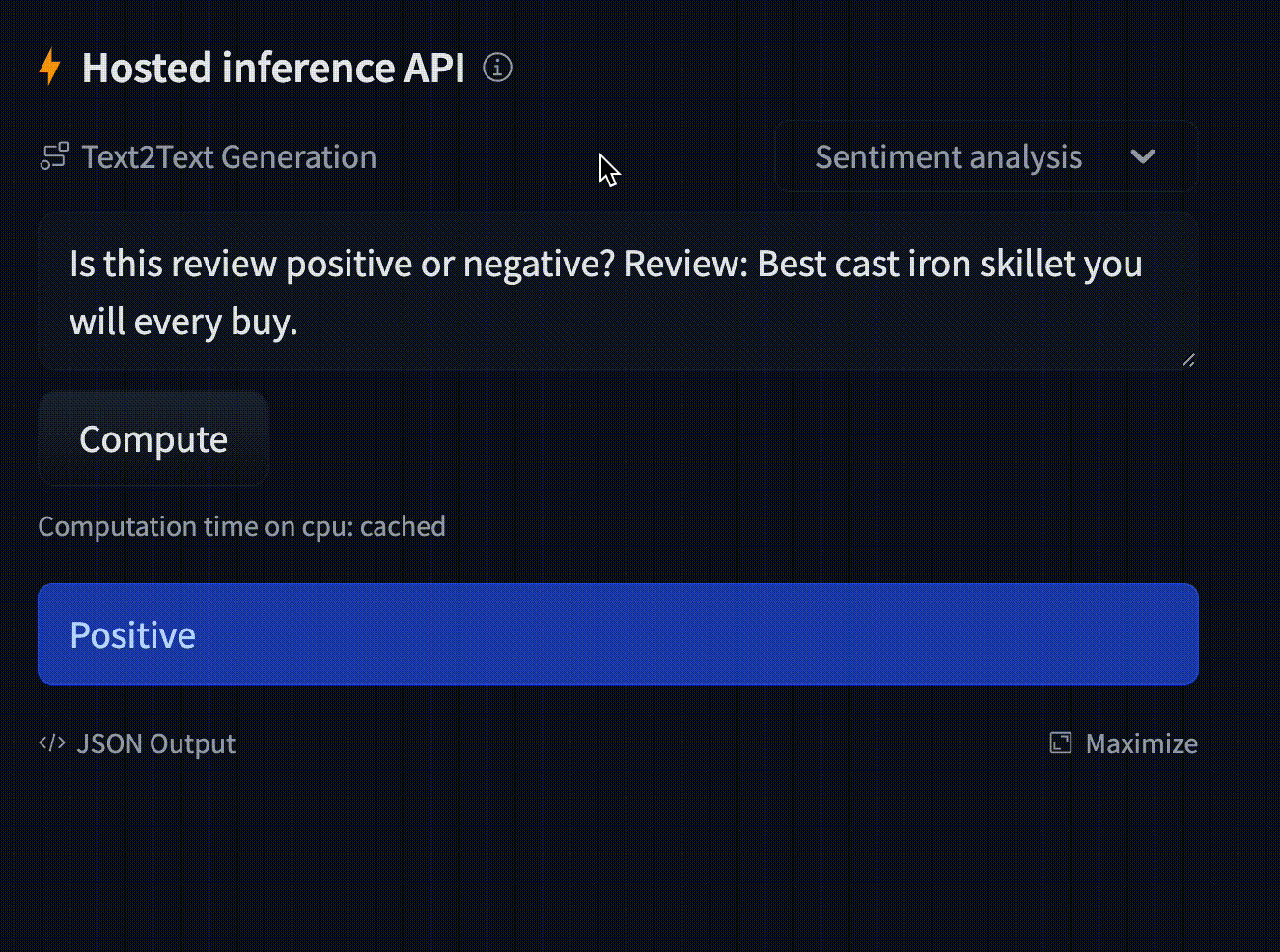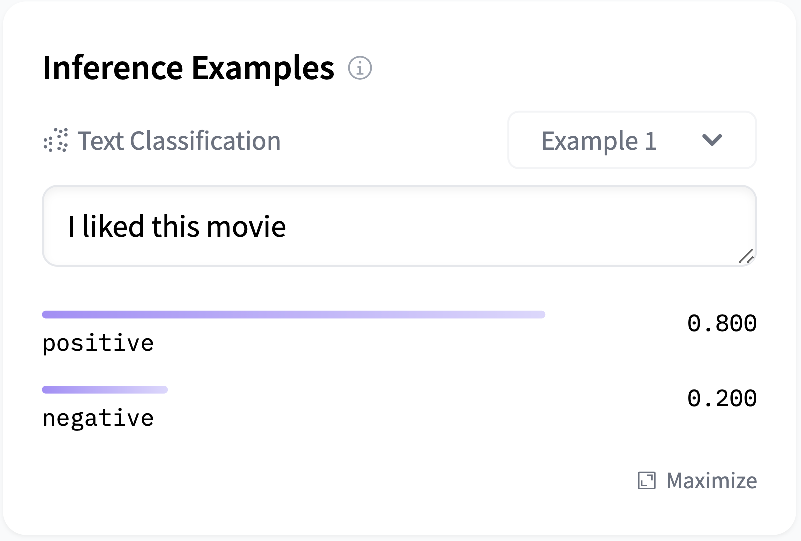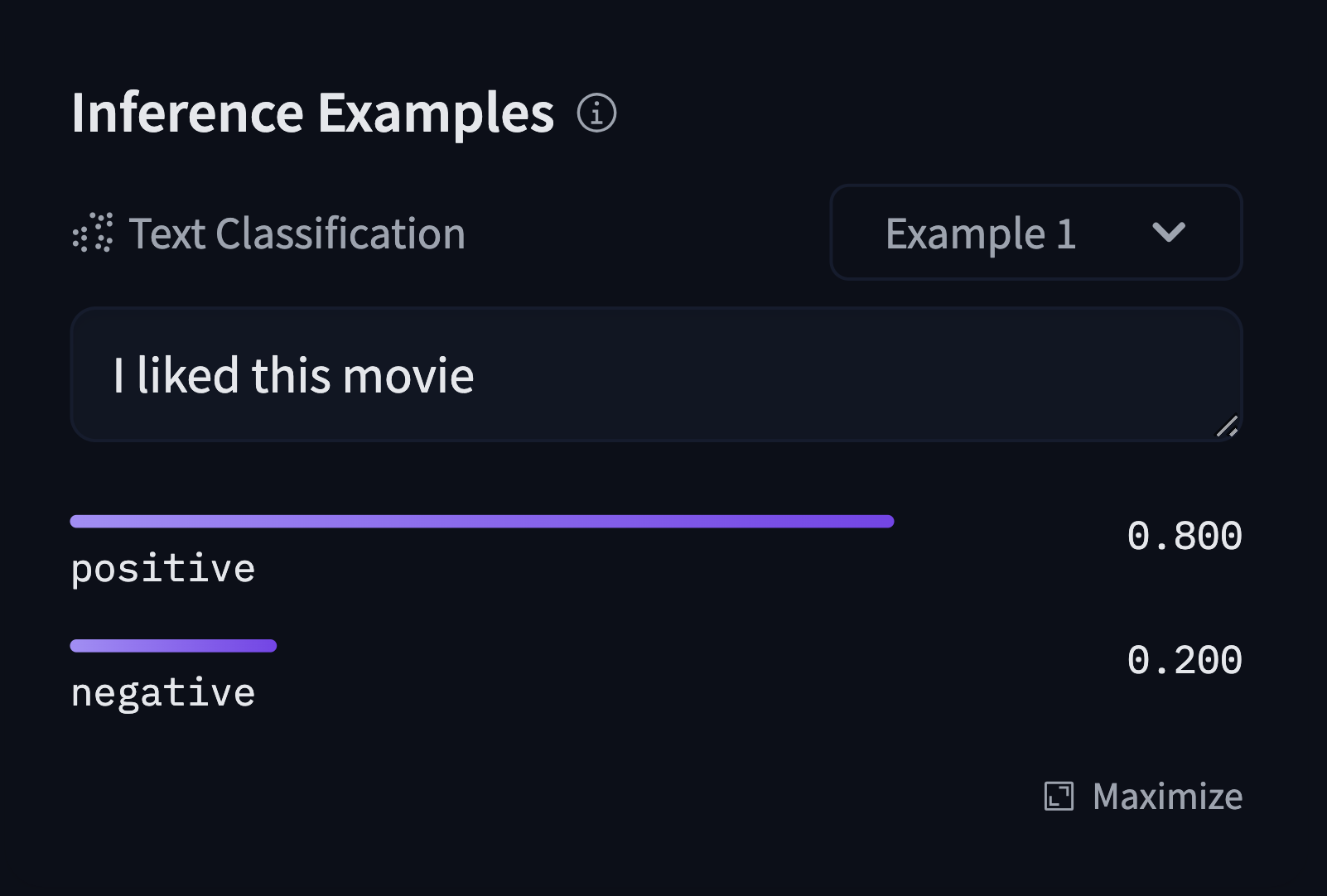 example_title: "Neutral Statement"You can provide more than one example input. In the examples dropdown menu of the widget, they will appear as Example 1, Example 2, etc. Optionally, you can supply example_title as well.