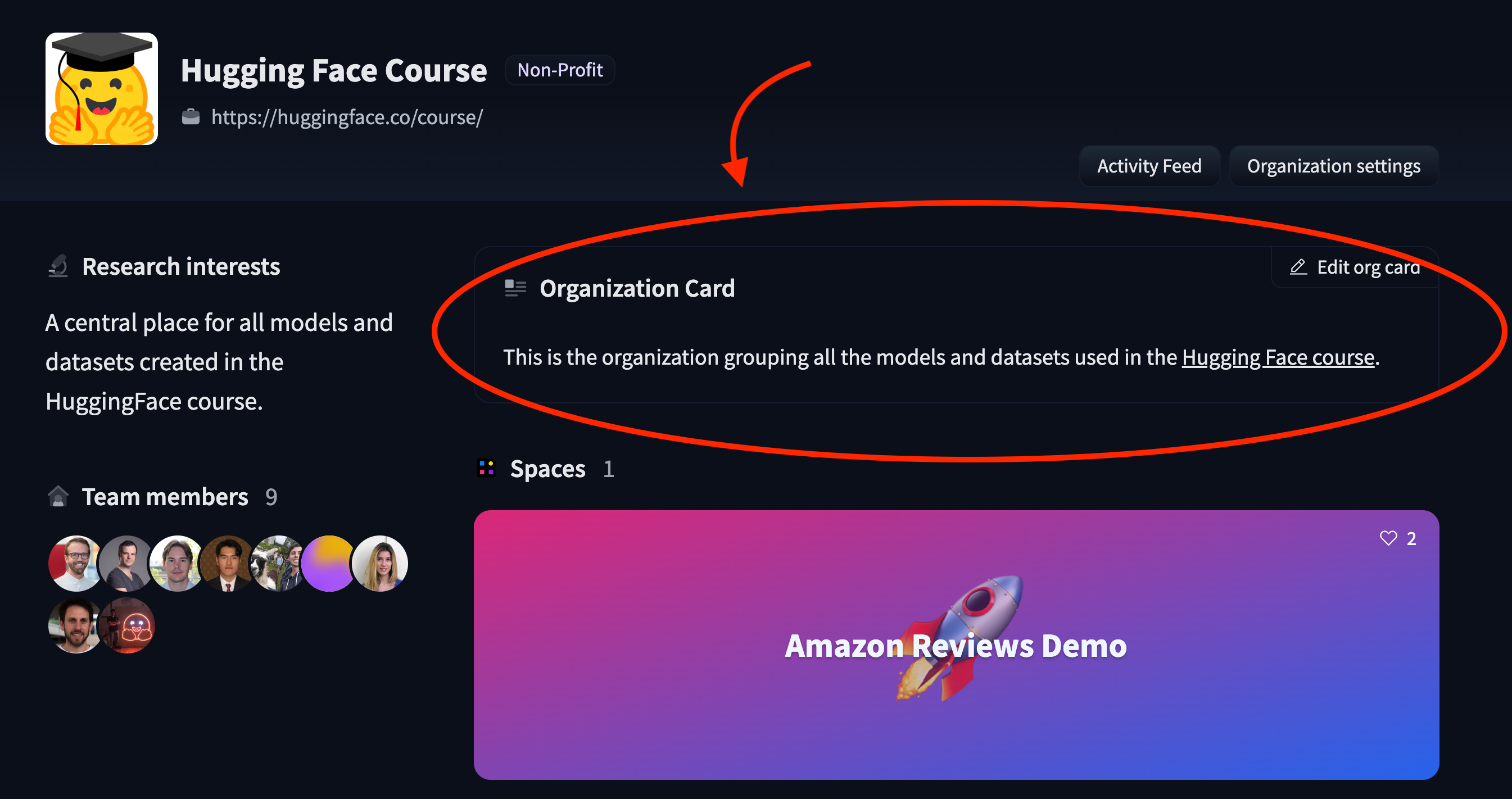 The card for the Hugging Face Course organization, shown above, contains the following HTML: