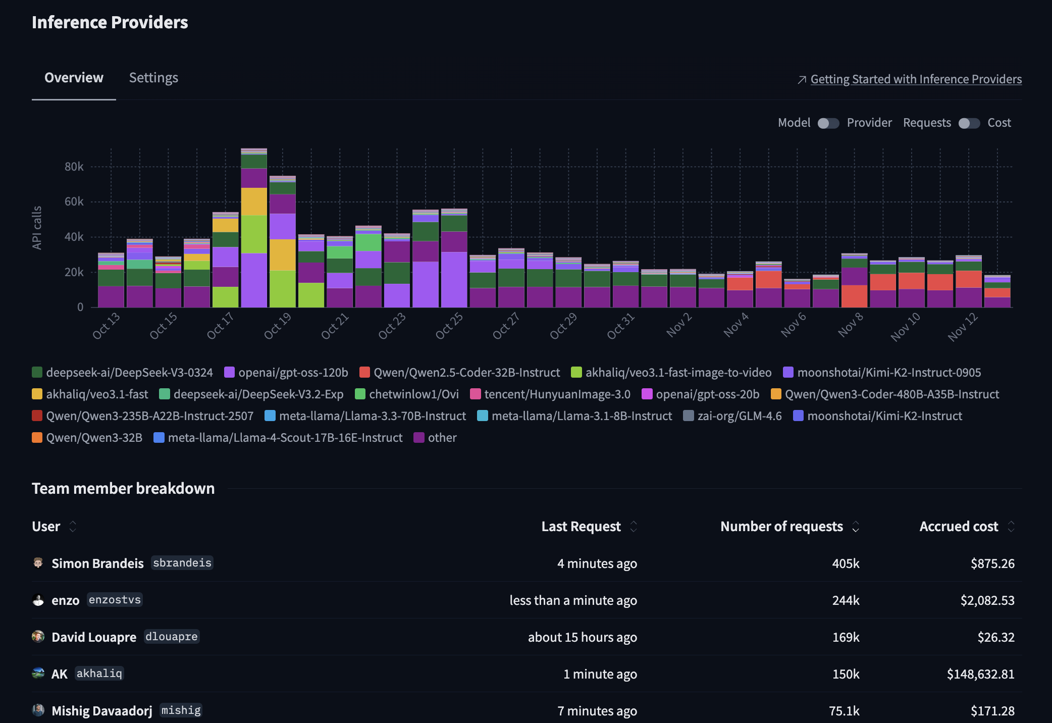 View detailed usage information for Inference Providers directly from your settings. Visit your Inference Providers Settings to see your usage for the past month, broken down by model and provider.