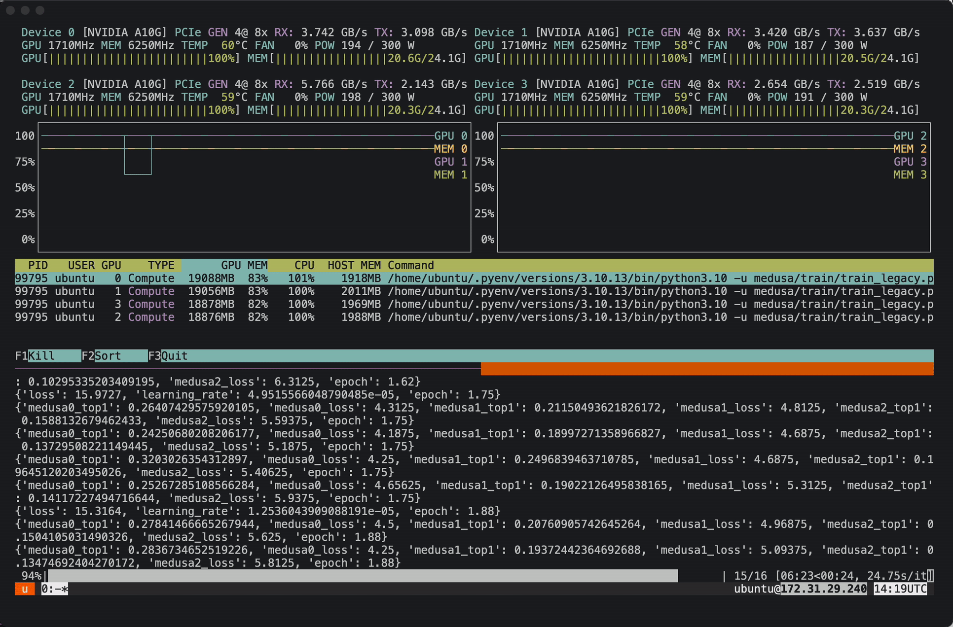 Using torchrun we can easily launch the medusa training script with the zephyr_self_distill.json configuration file.