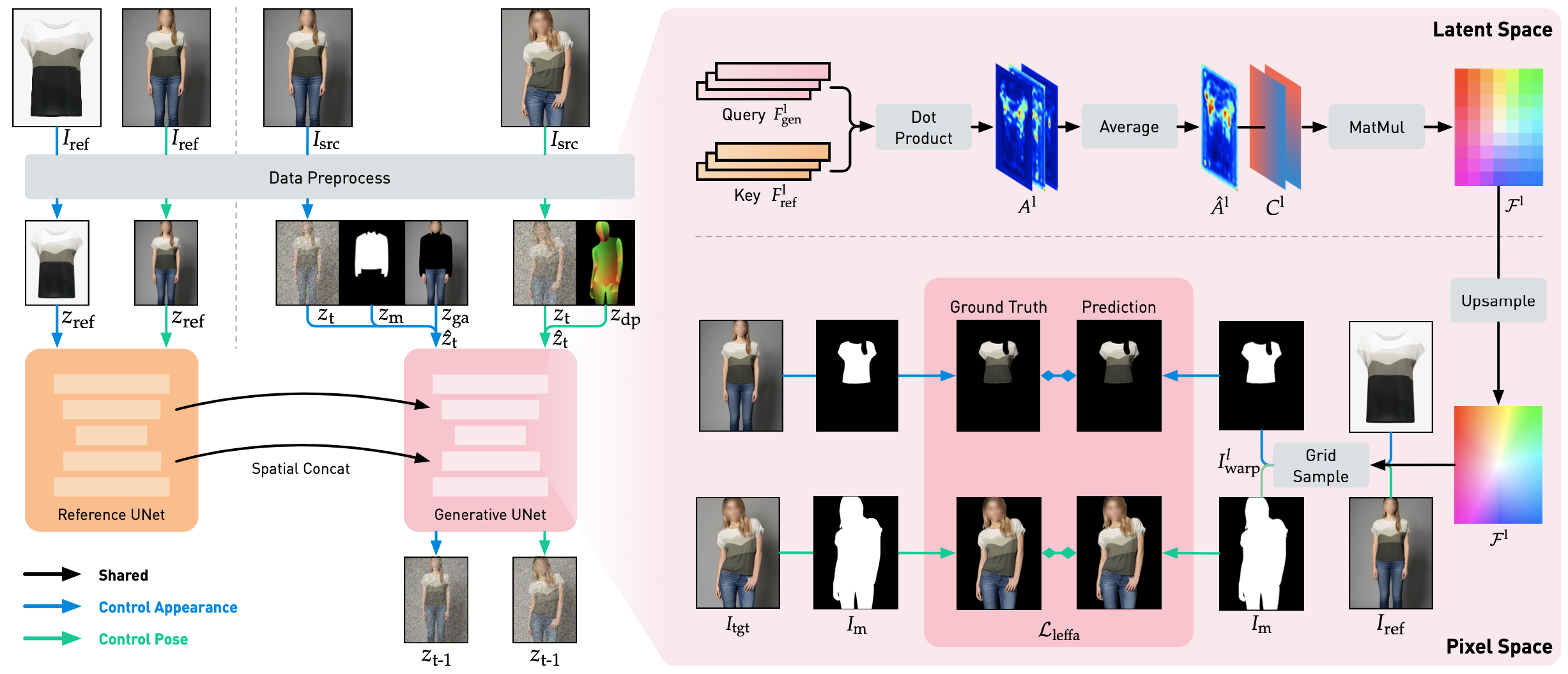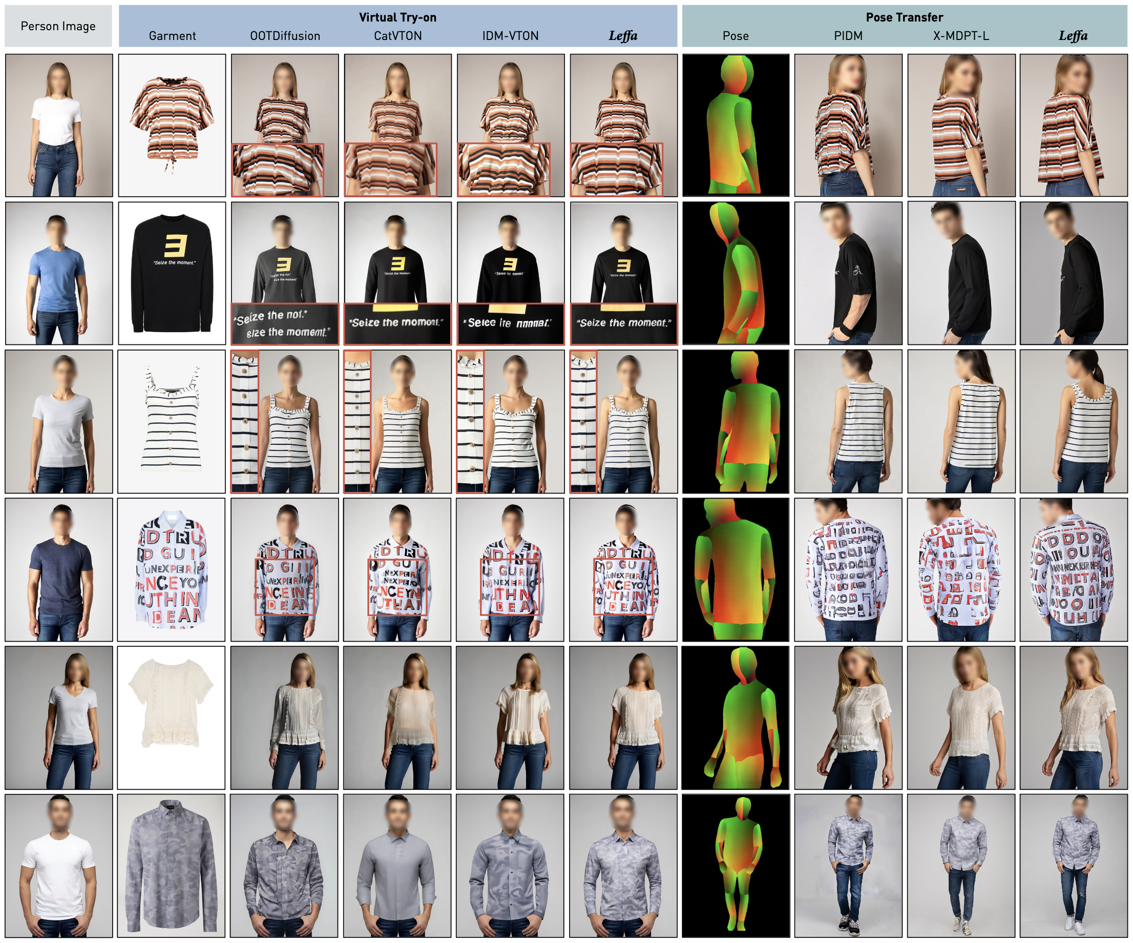 Leffa is a unified framework for controllable person image generation that enables precise manipulation of both appearance (i.e., virtual try-on) and pose (i.e., pose transfer).
