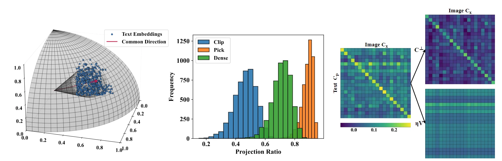 A: This arises from a conical distribution in CLIP representations (P1). To solve this, we develope a decomposition and reweighting of the CLIP representations, which significantly improve text alignment and reduce overfitting.